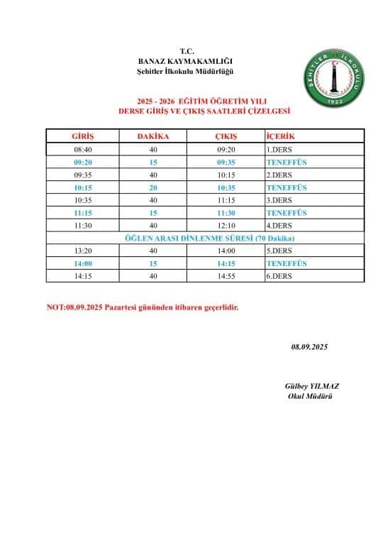 2025-2026 Ders Giriş Çıkış Saatleri